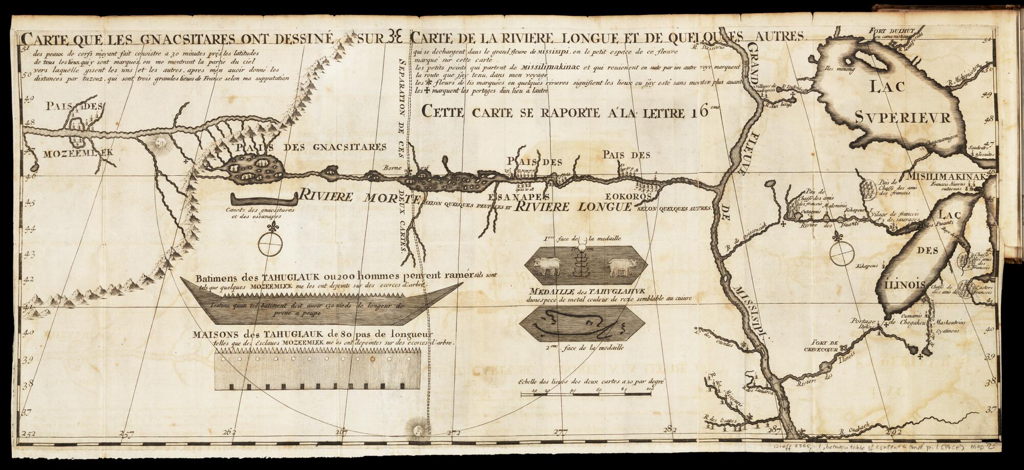 Carte de la riviere Longue et de quelques autres, qui se dechargent dans le grand fleuve de Missisipi ... ; Carte que les Gnacsitares ont dessine...
