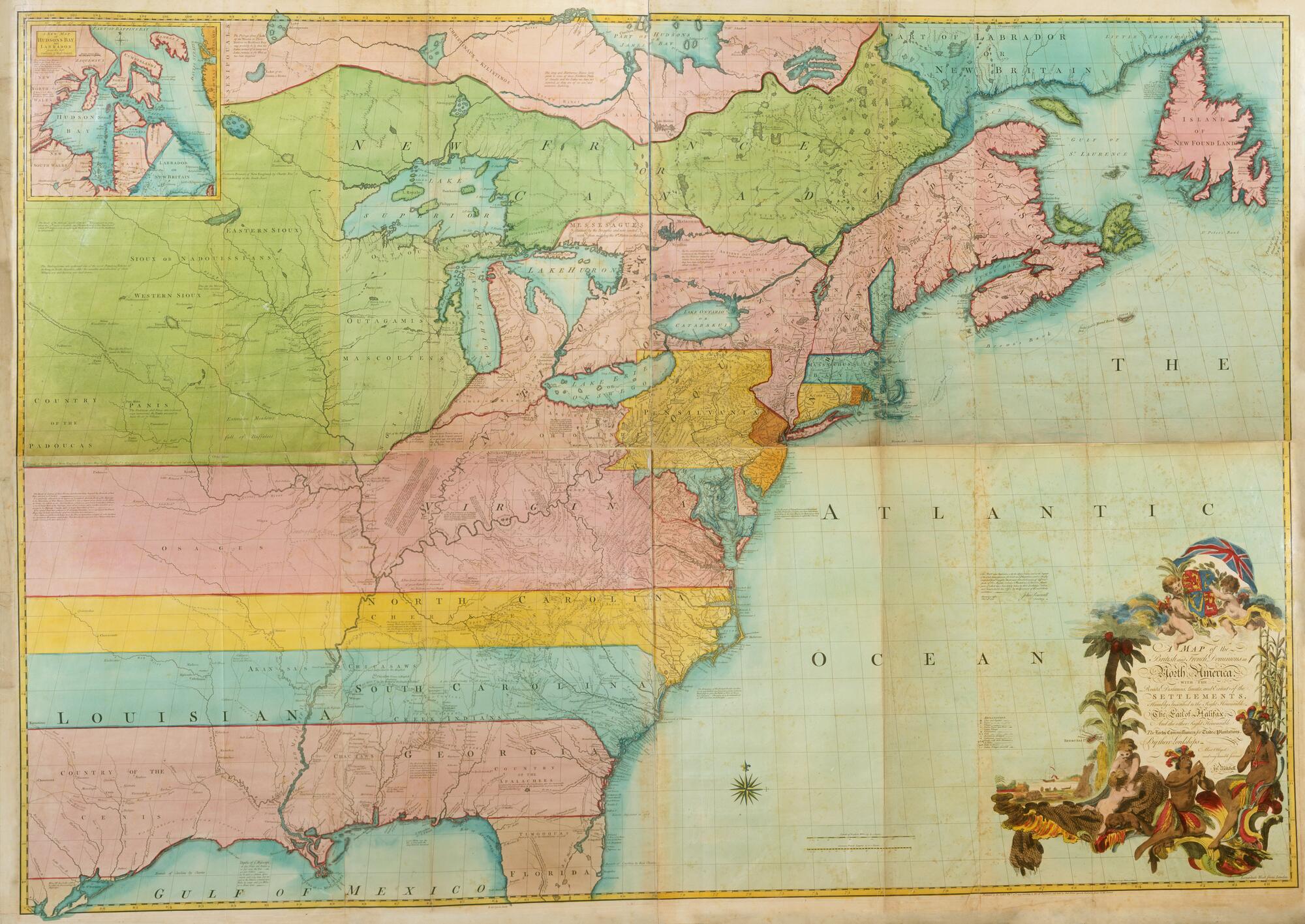Open book A map of the British and French dominions in North America : with the roads, distances, limits, and extent of the settlements, humbly inscribed to...