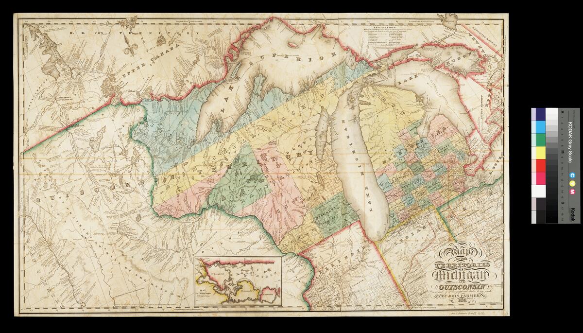 Open book Improved map of the territories of Michigan and Ouisconsin (pronounced Wisconsin)