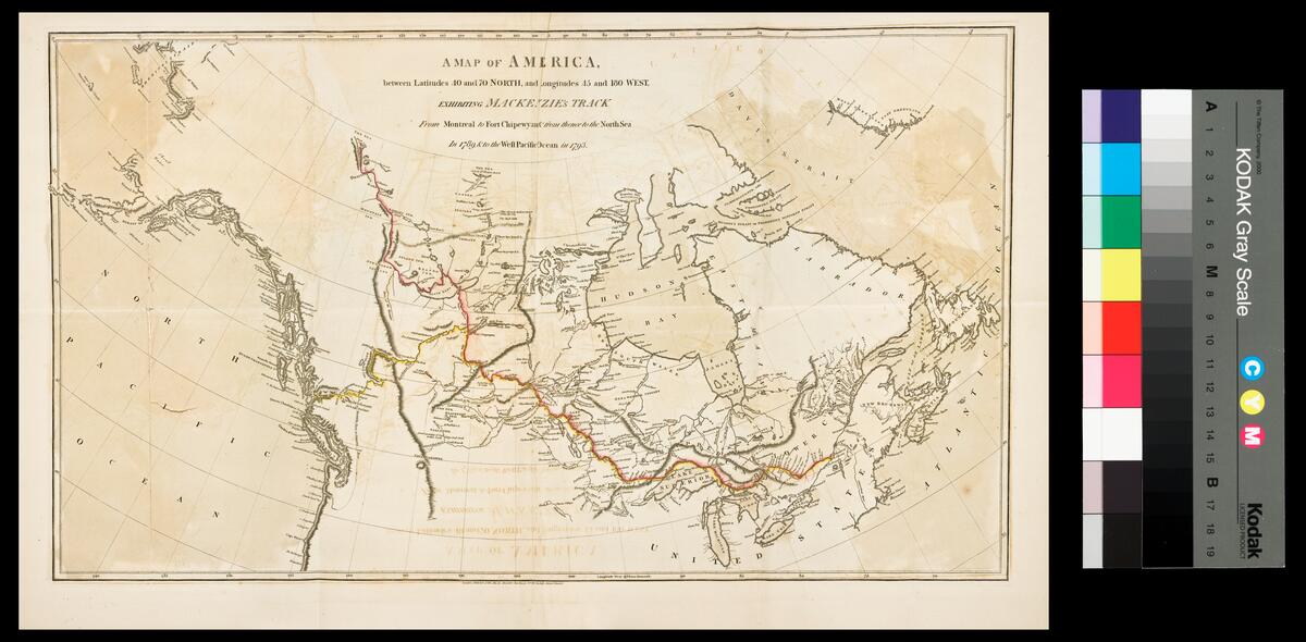 Map of America between latitudes 40 and 70 north and longitudes 45 and 180 west, exhibiting Mackenzie's track from Montreal to Fort Chipewyan & from...