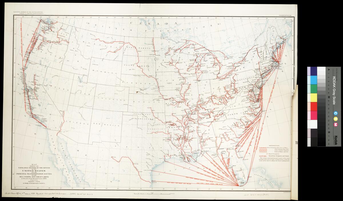 Open book Map showing the navigable depths of the rivers of the United States and the principal transportation routes on the sea-coasts and Great Lakes in the...
